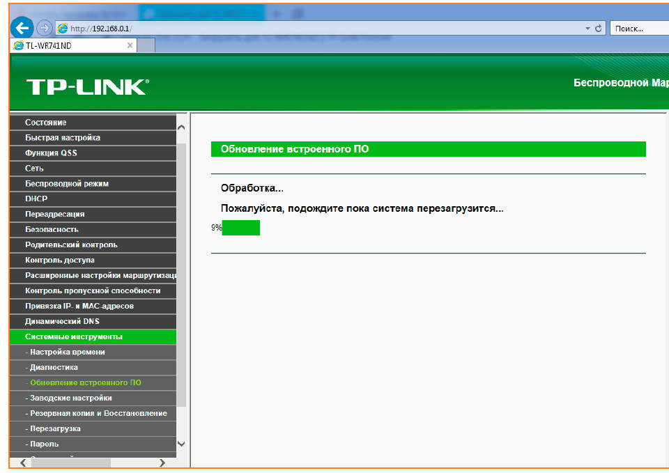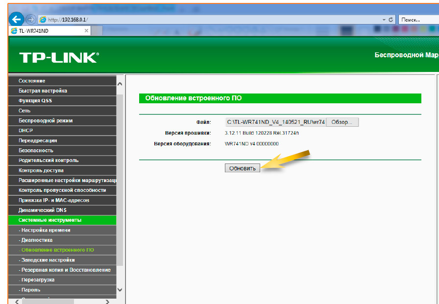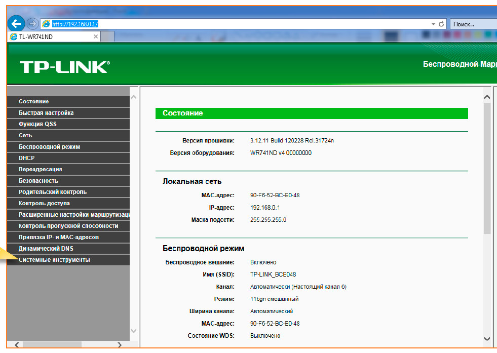 Теперь непосредственно рассмотрим сам процесс прошивки на примере роутера TP-Link TL-WR741N. Для прошивки нужно зайти в меню настроек роутера, как это сделать можно посмотреть в инструкции: «Как настроить роутер?»
