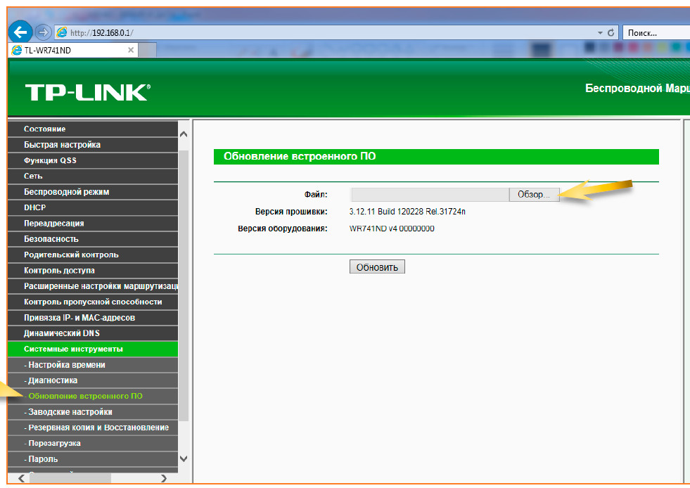 В разделе «Системные инструменты» выбрать пункт «Обновление встроенного ПО» и затем нажать кнопку «Обзор».