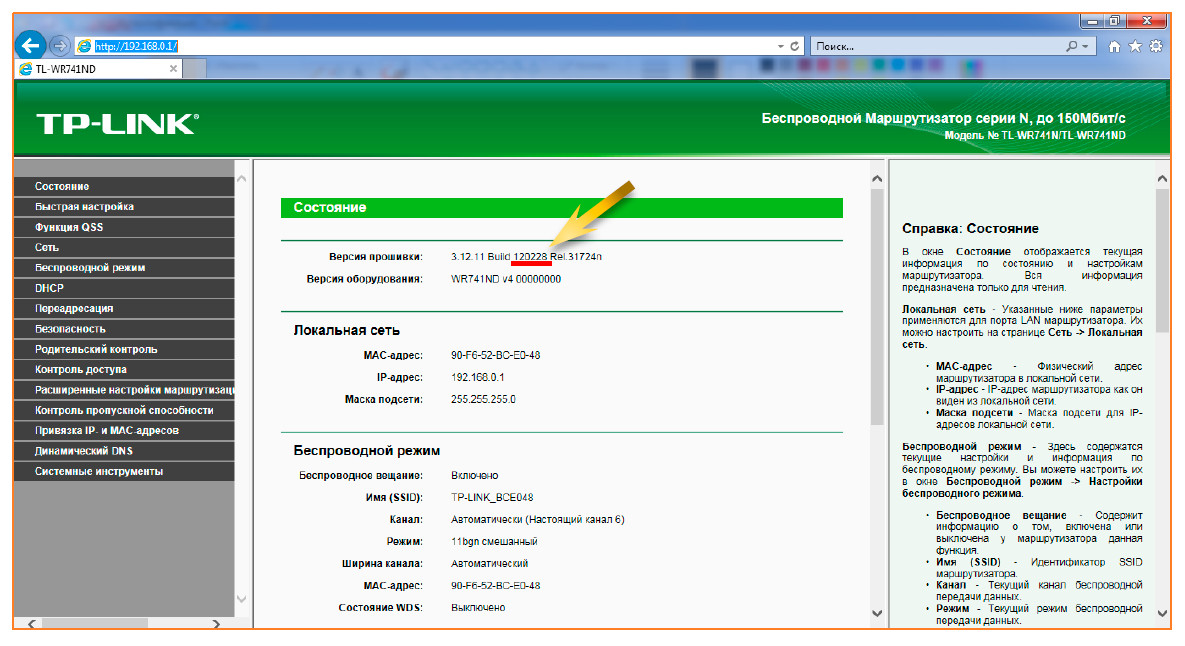 На странице «Состояние» можно посмотреть текущую версию прошивки, в нашем примере, это 120228.