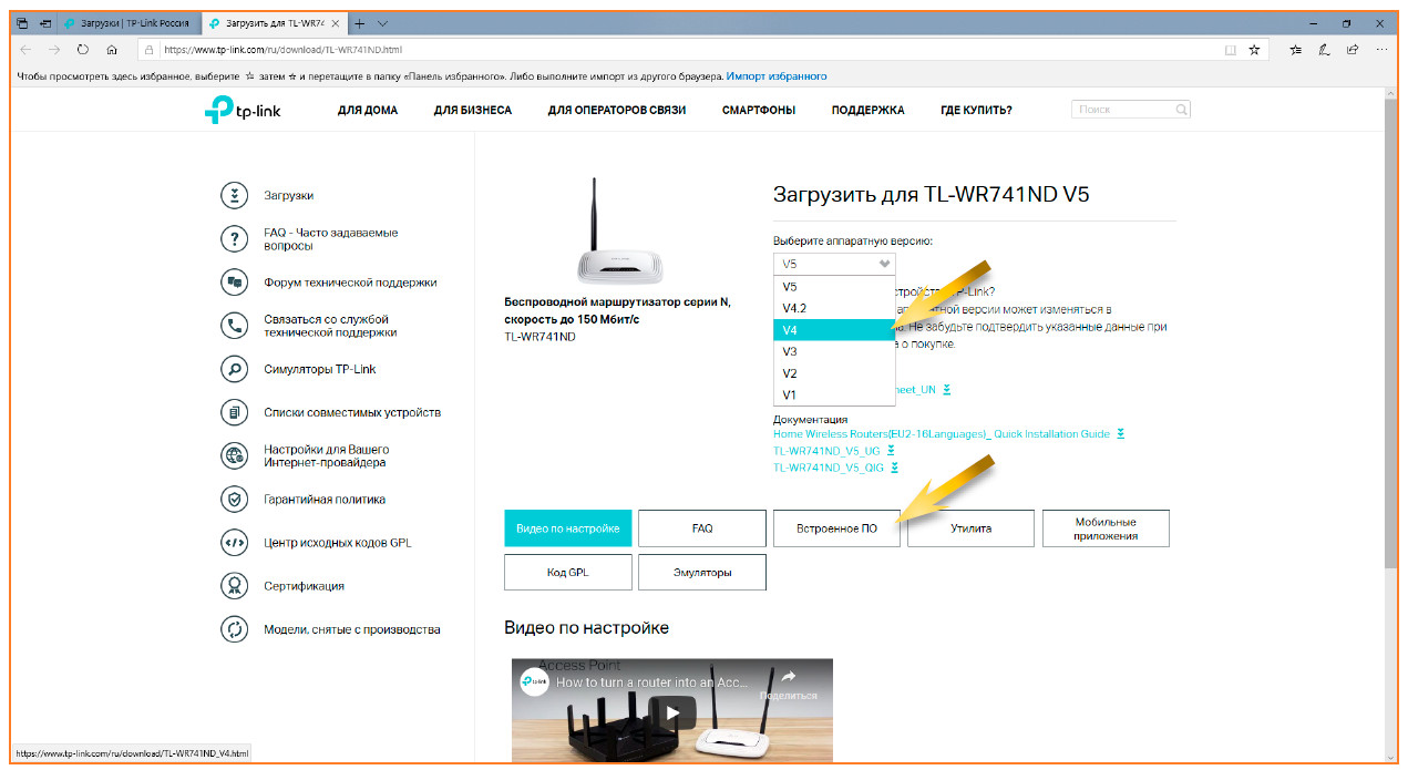 На открывшейся странице в поле: «Выберете аппаратную версию», выбираем аппаратную версию прошивки своего роутера: «V4» и затем нажимаем на кнопку: «Встроенное ПО».